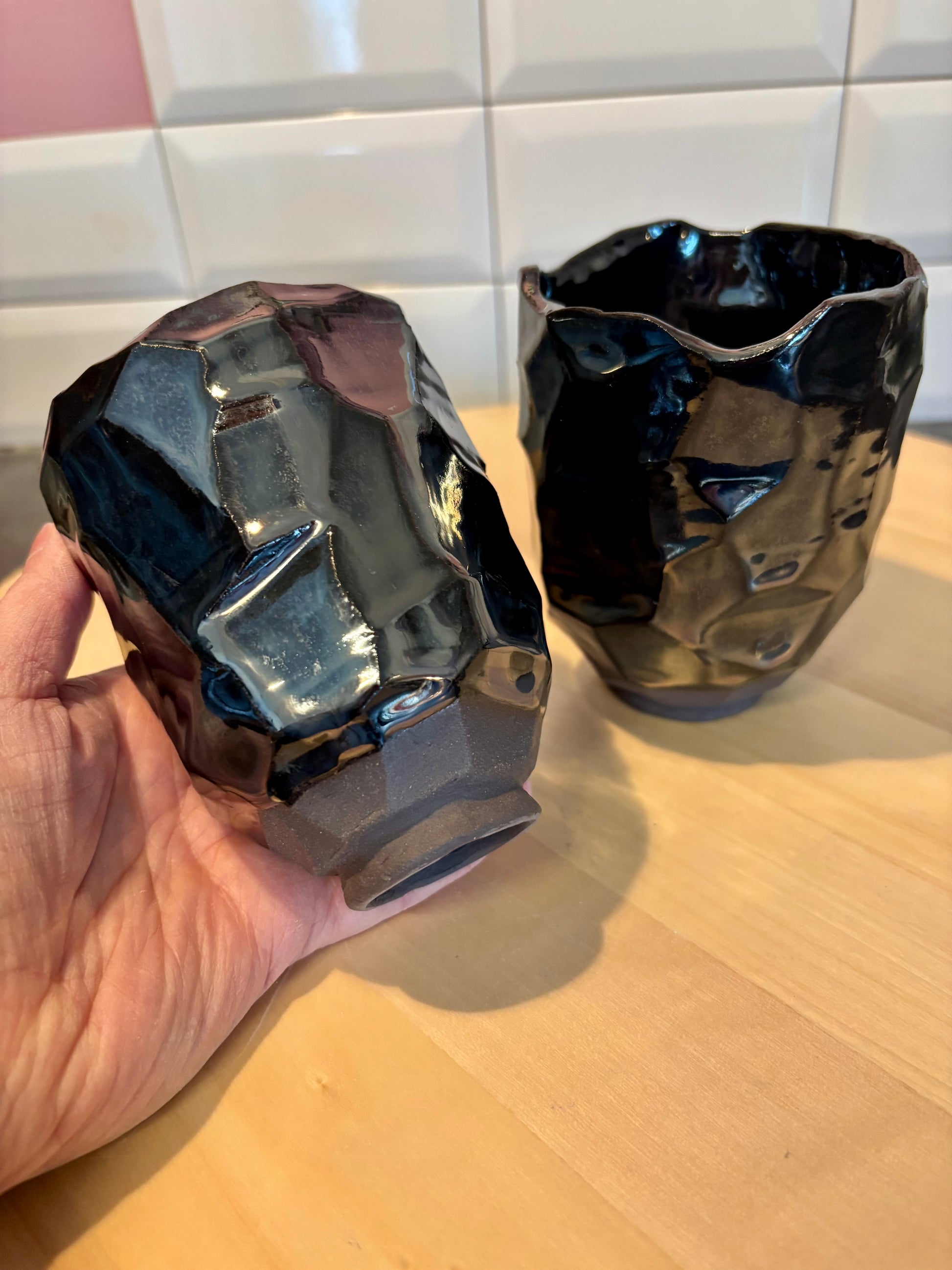 Håndlavet kop i sort ler med kurinuki-teknik – en japansk traditionsmetode, hvor overfladen bearbejdes for at skabe unikke teksturer og dybde. Hver kop er et kunstnerisk værk med organiske variationer i form og finish. Perfekt til te eller kaffe, hvor materialet bevarer væskens temperatur. Ideel for den, der værdsætter autentisk keramik og håndværkets subtile skønhed.